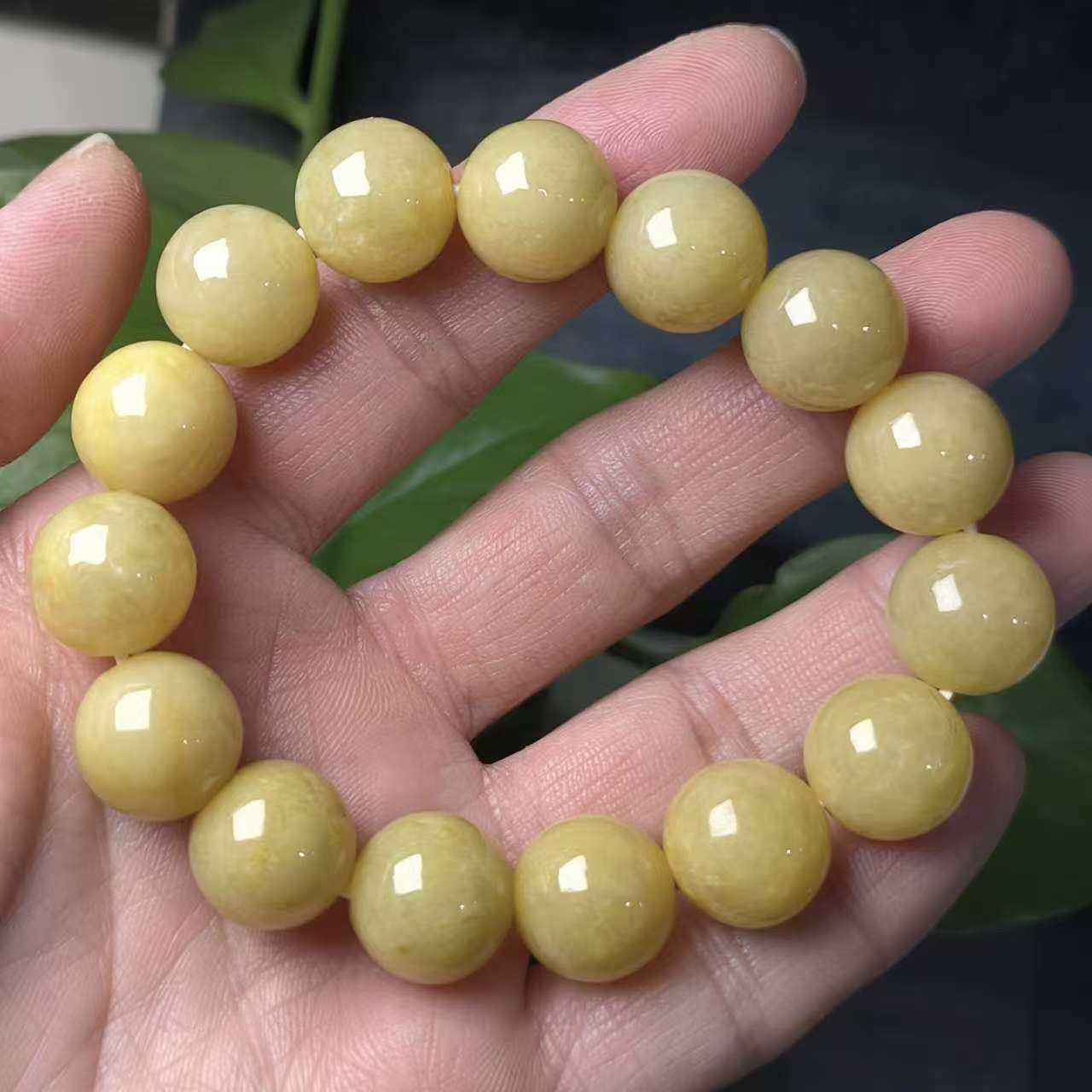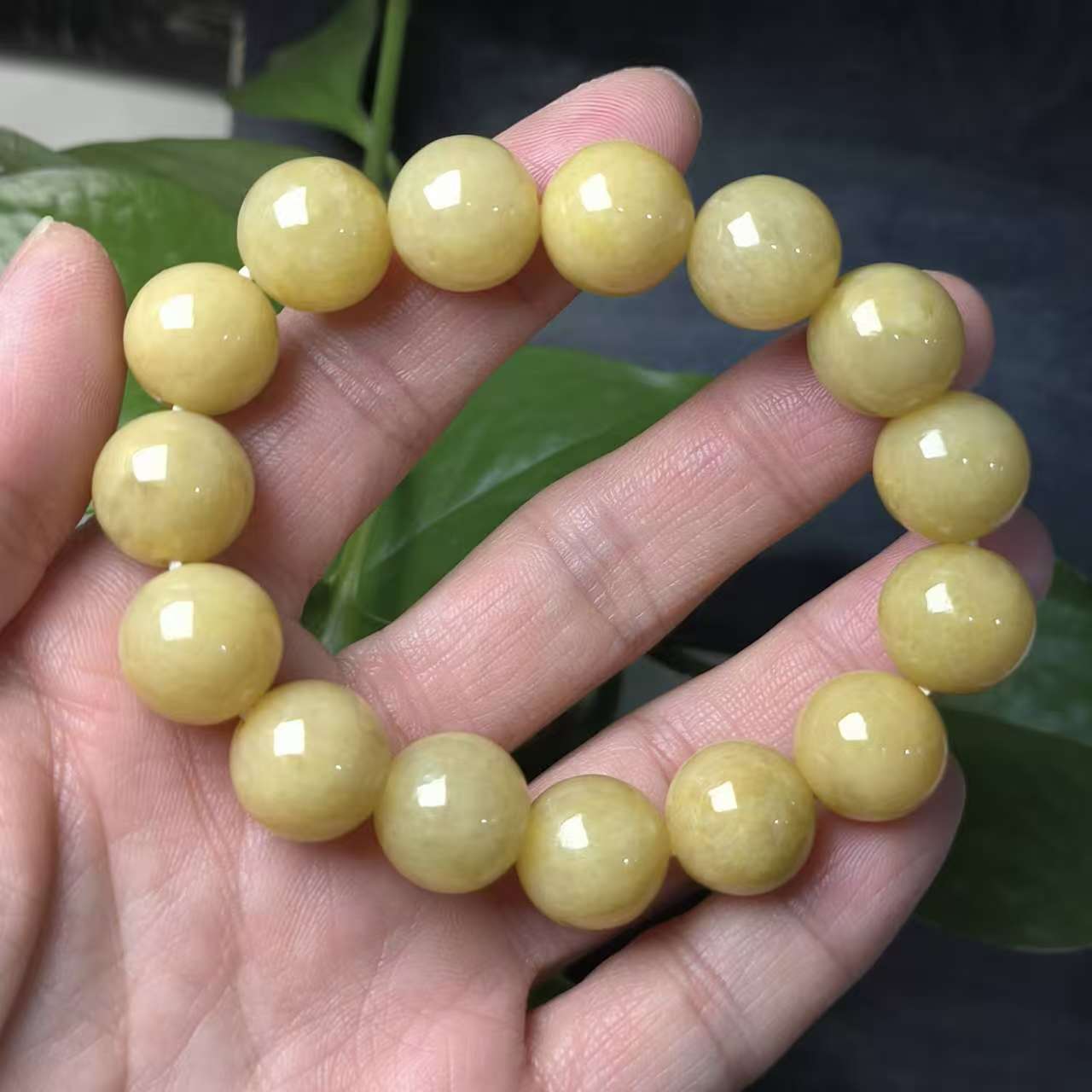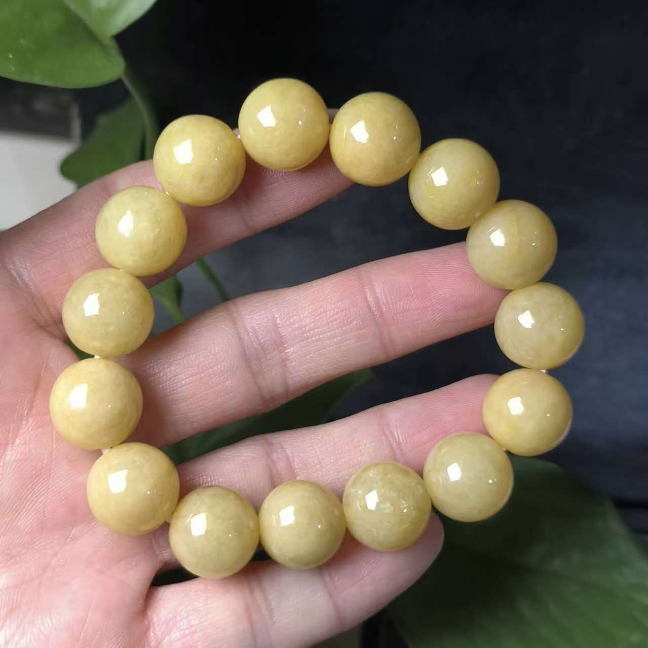 ⿻ 商品描述:在翡翠里,天然满黄翡的大珠子少见。该手链珠子直径大,满身黄翡,较为难得。性价比很高。因为其特殊的黄色,有很不错的寓意。由于此种料子较为稀缺,该手链值得重视