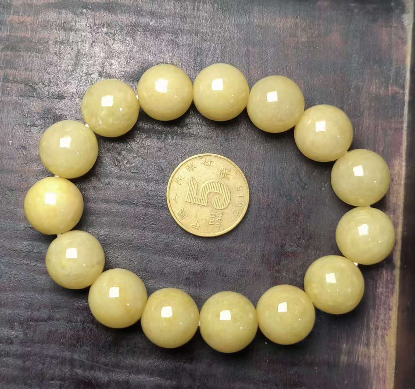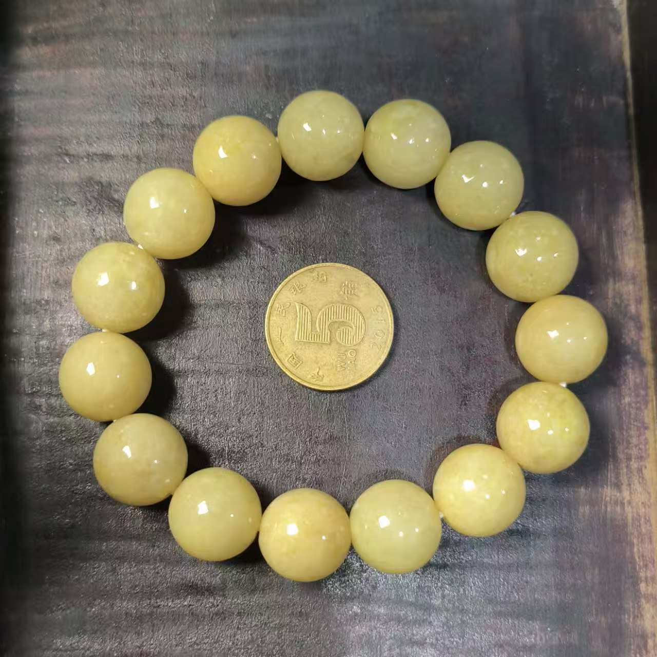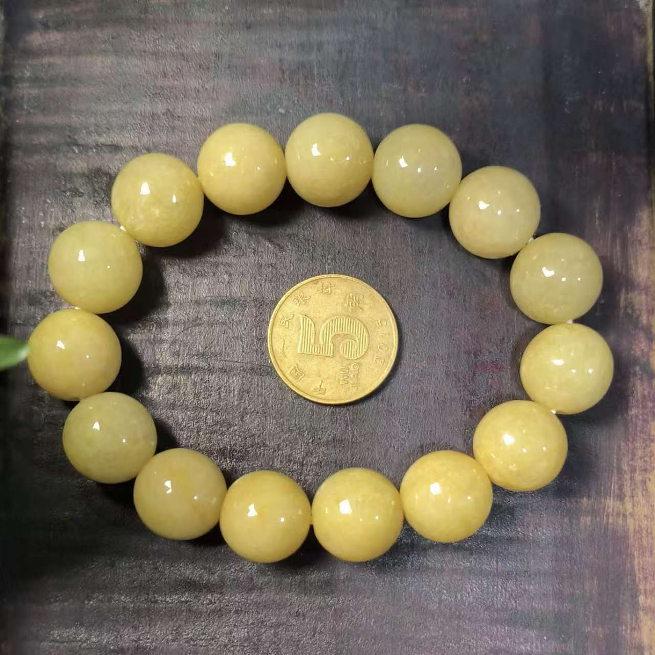 ⿻ 商品描述:在翡翠里,天然满黄翡的大珠子少见。该手链珠子直径大,满身黄翡,较为难得。性价比很高。因为其特殊的黄色,有很不错的寓意。由于此种料子较为稀缺,该手链值得重视
