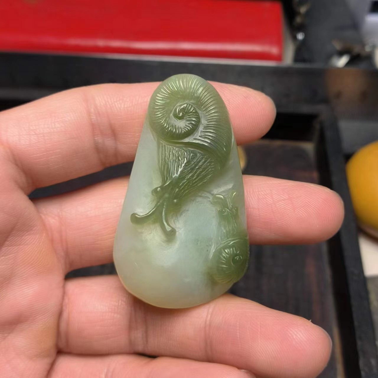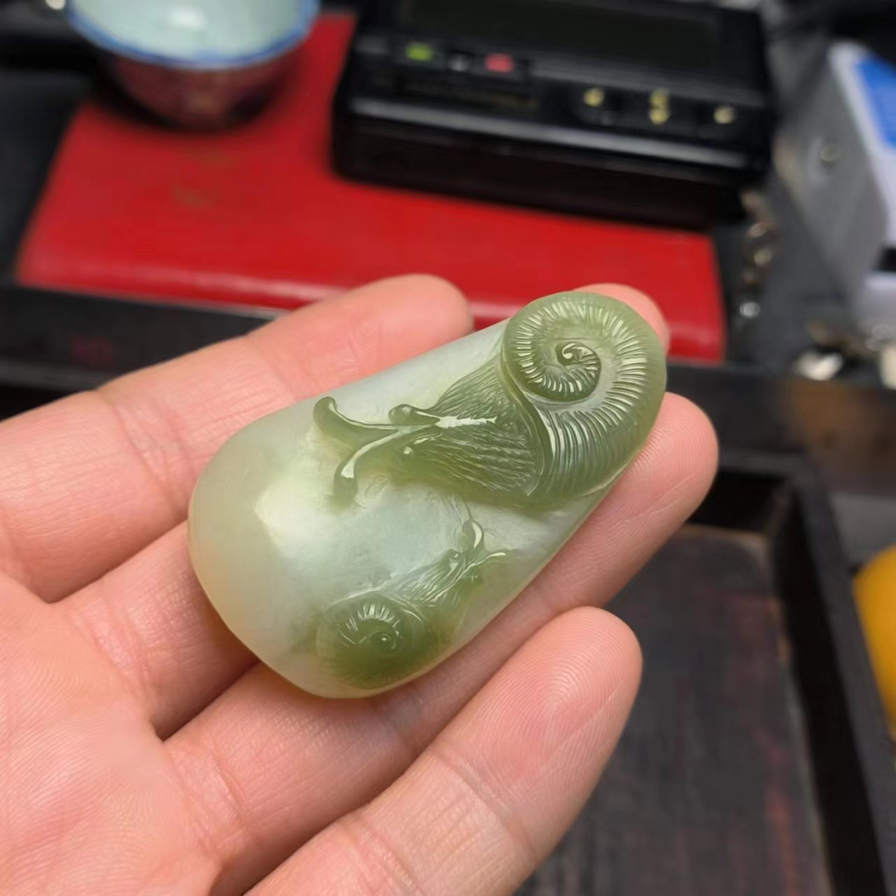 ⸙ 商品描述:利用翠色部位巧雕两只蜗牛,惟妙惟肖,寓意扭转乾坤。