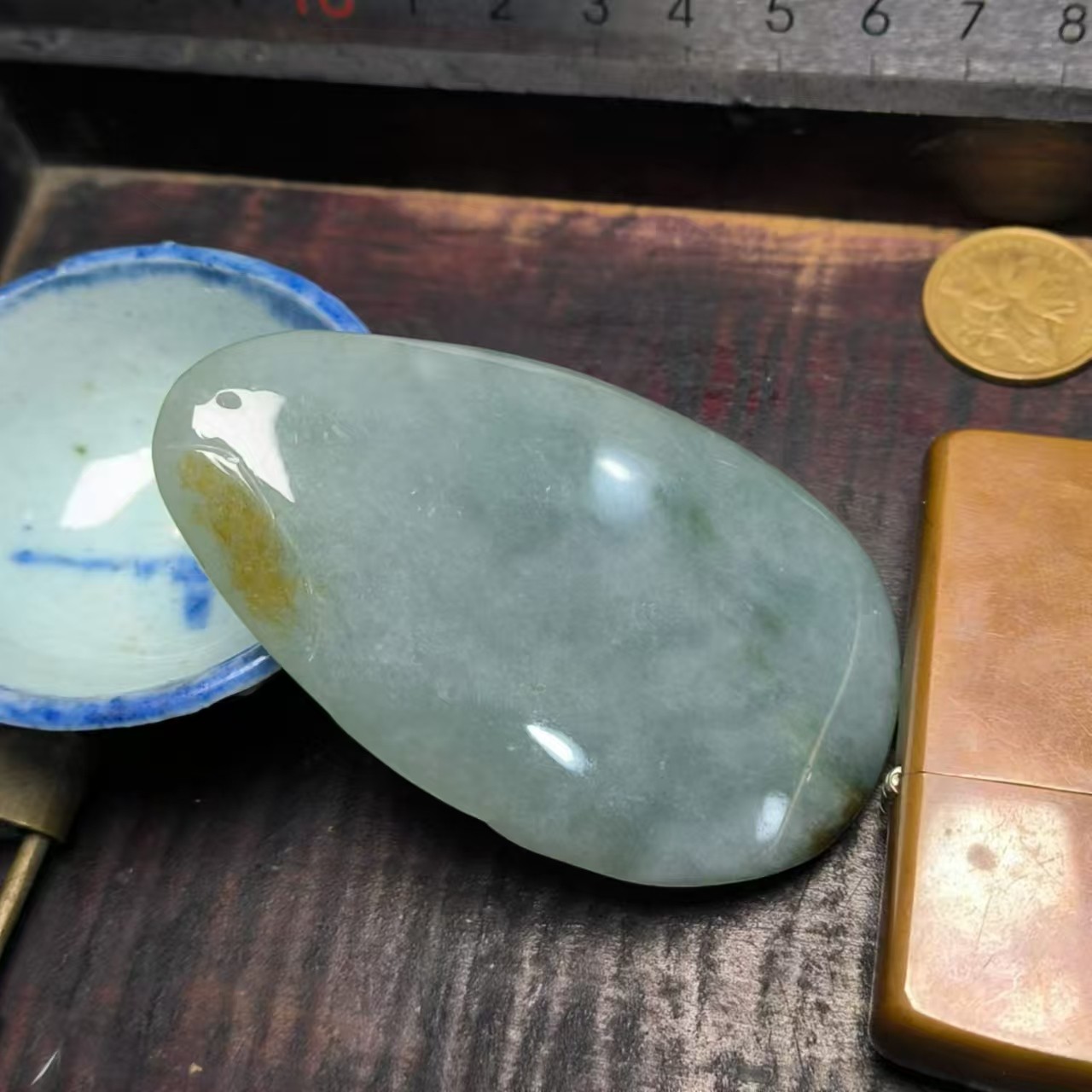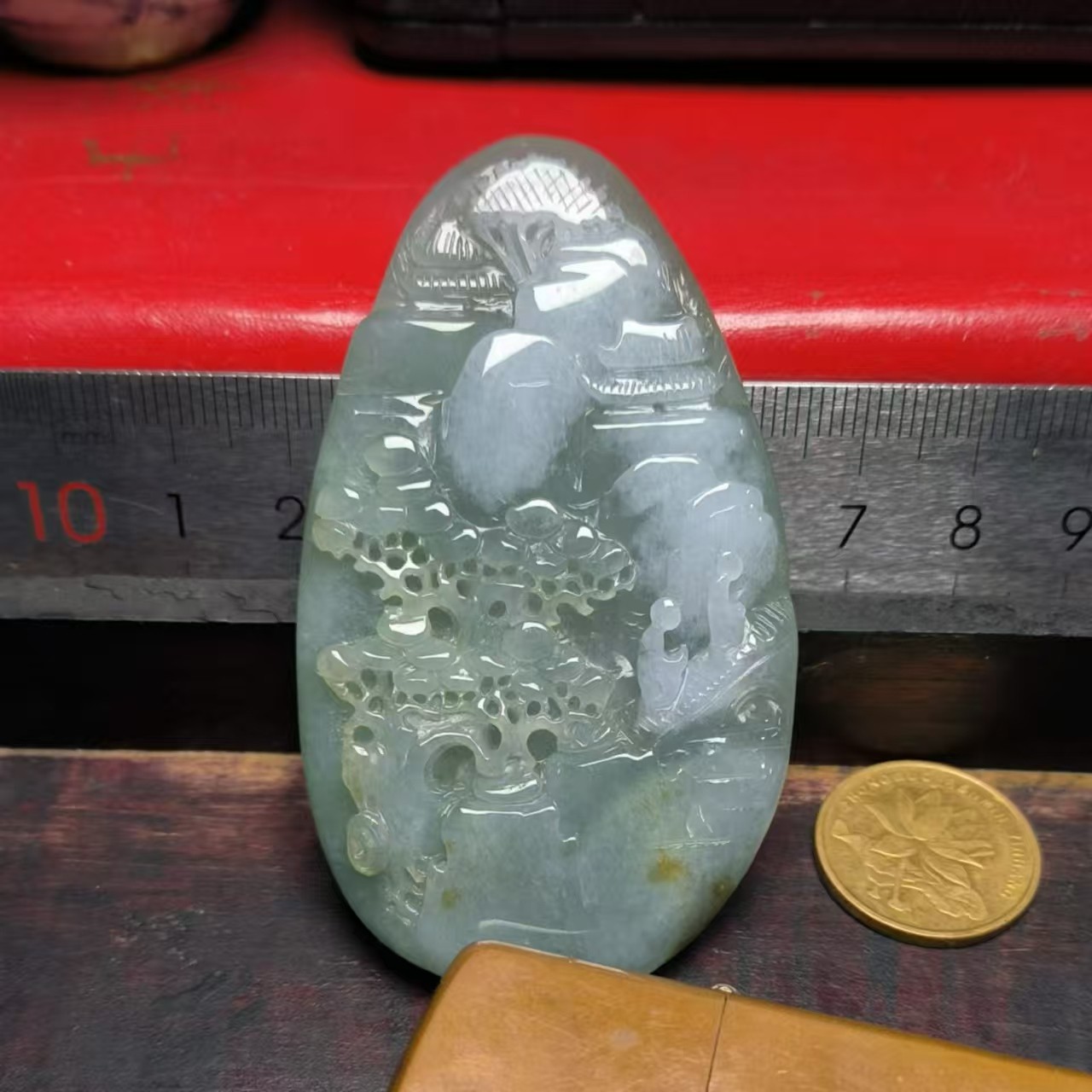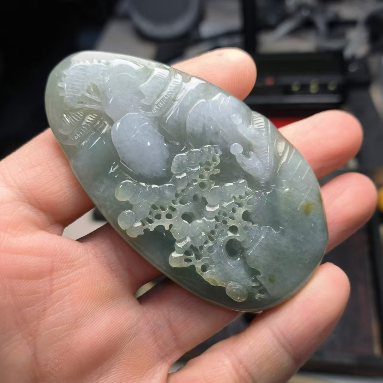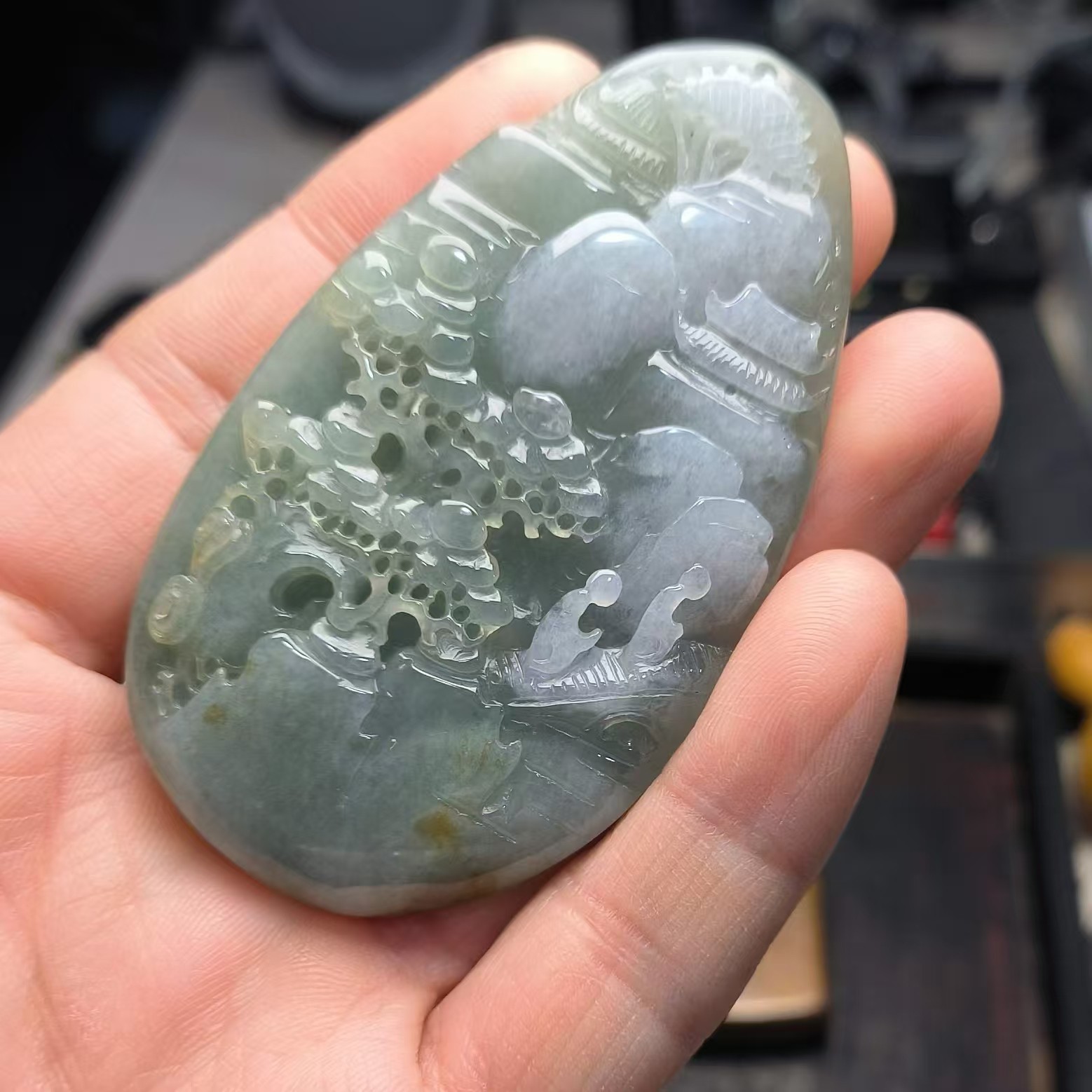 ⸙ 商品描述:俏色雕刻,利用料子白色部位巧雕,仿佛白云飘过染白了山石亭台和松树,整体观感非常舒适。个头较大,厚度适中,非常利于男性佩戴,也可做女性毛衣链。