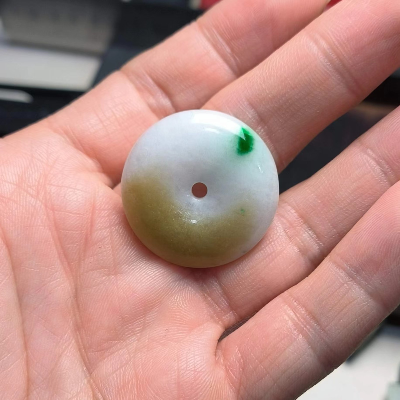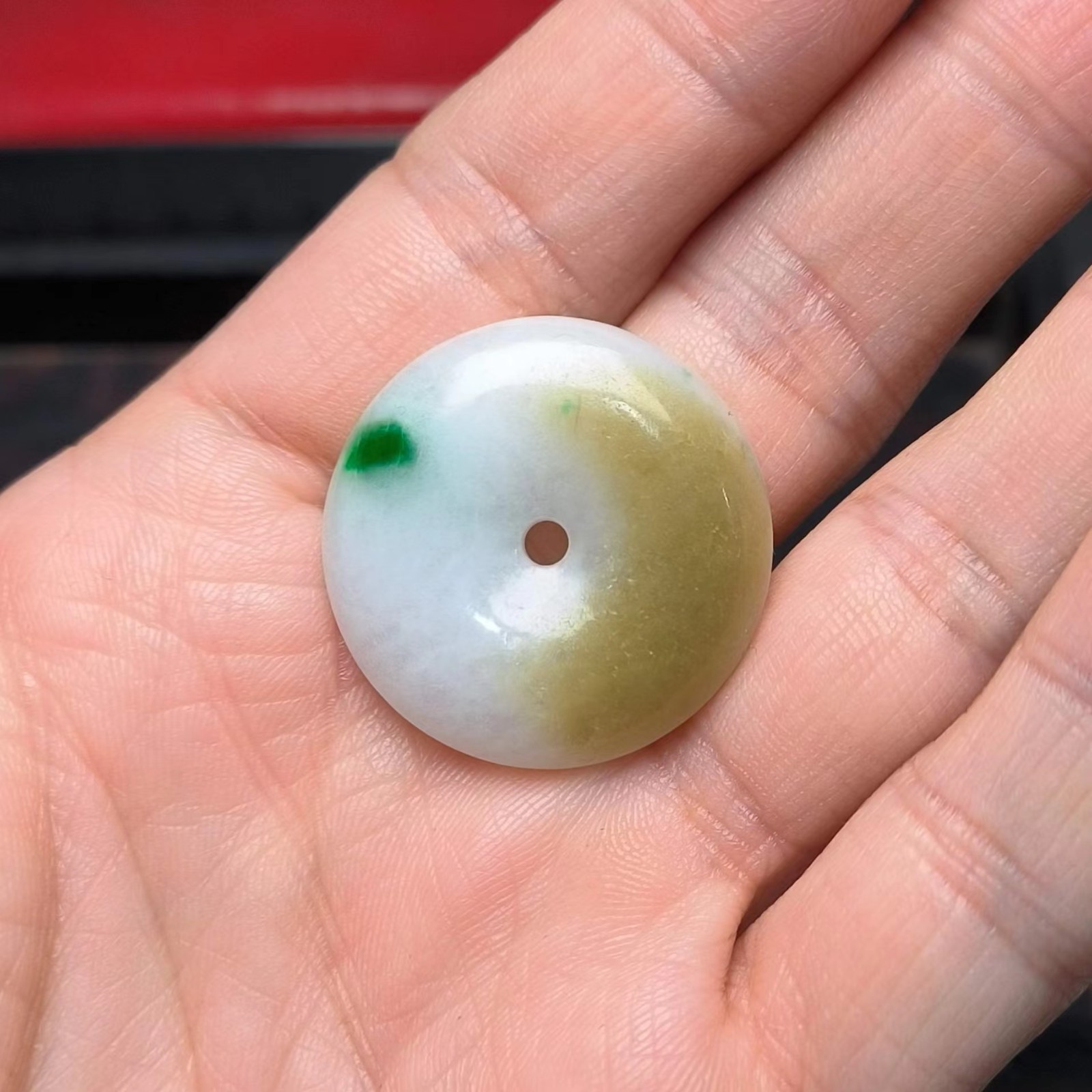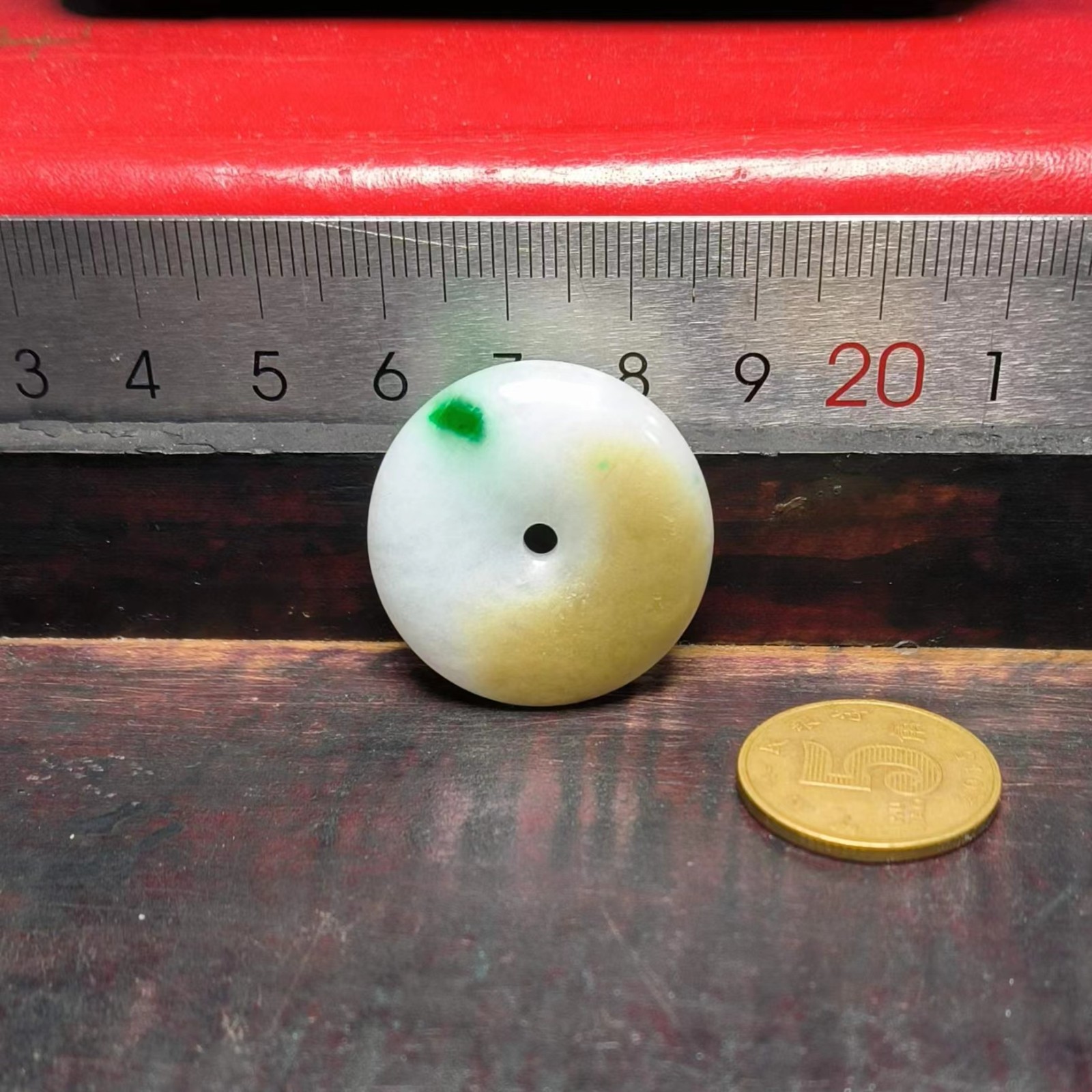 ⿷ 商品描述:非常有特点的一块平安扣,阳绿加黄翡,而且整体颜色造型奇特,具有吸引力