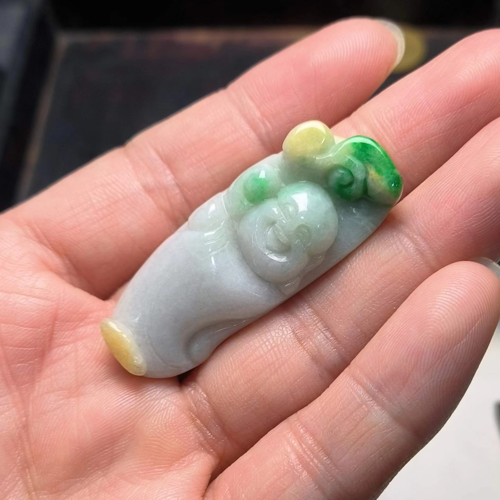 ⿷ 商品描述:三色料子比较少,阳绿在弥勒佛头顶,寓意“好彩头”。手工雕刻开脸惬意,非常富有神态